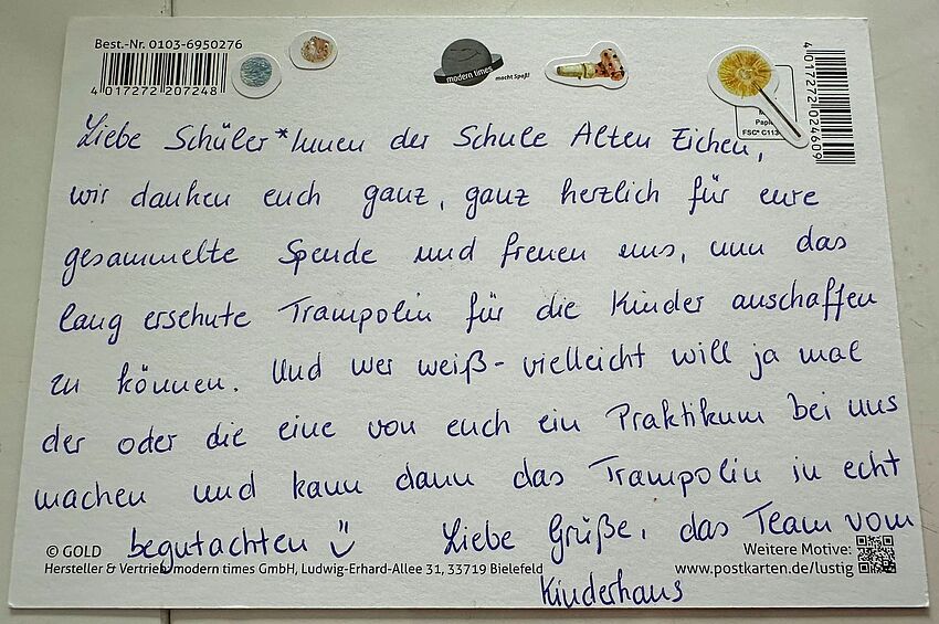 Bei unserer Osterandacht am 05. April sammelte unsere Klasse die FS2 eine Kollekte für das Kinderhaus am See in Allermöhe. Wir bedanken uns für die zahlreichen Spenden, insgesamt wurde ein Betrag von 432,15 Euro von der Schulgemeinschaft gespendet.