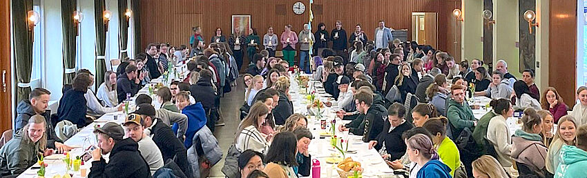 Wir die FS2 haben uns getroffen um mit der ganzen Schule im Mutterhaussaal Ostern zu feiern. Im Eingangsbereich haben wir alle mit einer Feuerschale empfangen wo jeder der wollte einen Zettel rein werfen konnte mit negativen dingen drauf, die einen beschäftigen und die man los lassen wollte. Mit diesem Feuer wurden Kerzen für jede Klasse entzündet, die sie nach der Andacht mit in ihre Klassen nehmen konnten. Anschließend haben wir an den schon gedeckten Tafeln gemeinsam gefrühstückt, während des Frühstücks gab es den Impuls „was ist das Licht in deinem Leben?“. Auf den tischen waren Stifte mit den alle auf die Tischdecken malen oder schreiben konnten was ihnen dazu eingefallen ist. Am ende der Andacht haben wir eine großzügige Kollekte für das Kinderhaus am See sammeln können. Wir haben uns sehr über das zahlreiche erscheinen und die positiven Rückmeldungen gefreut und es besteht bedarf zur Wiederholung.